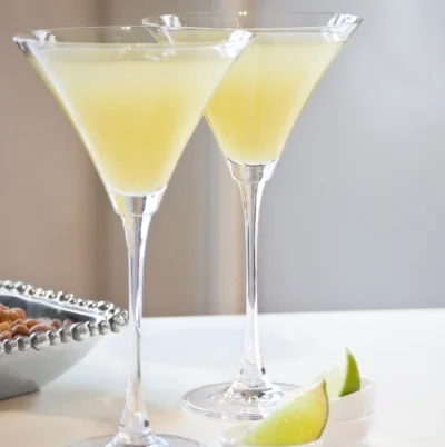 Pour into chilled martini glasses or serve over ice. Garnish each with a thin slice of the remaining lime.